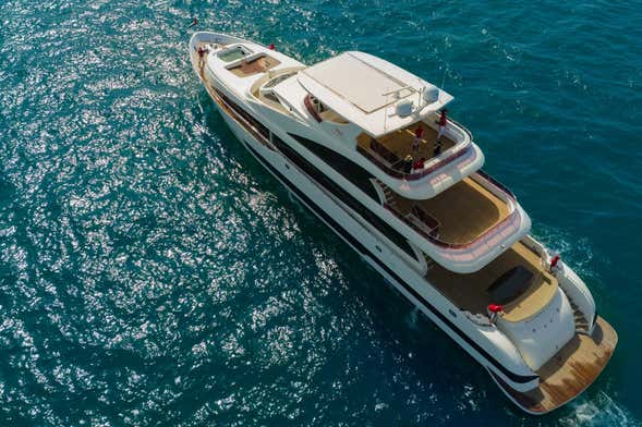 You'll be greeted with a welcome drink, and then you can settle in to enjoy the views. We'll pass near Bluewaters Island, where we'll see the famous 250-meter-high Ferris wheel and the set of artificial islands that form Palm Jumeirah. We'll also make a stop so that you can take a refreshing swim.